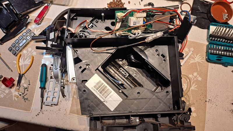 Par chance, j'ai trouvé une Magnifica S (ECAM 21.117.B) dans la benne, ce qui m'a permis de m'entraîner au démontage, de voir la différence (celle de la benne avait la pompe foutue et aucun accessoire, en plus d'être cassée de partout) et de récupérer la pièce défectueuse pour la mienne.