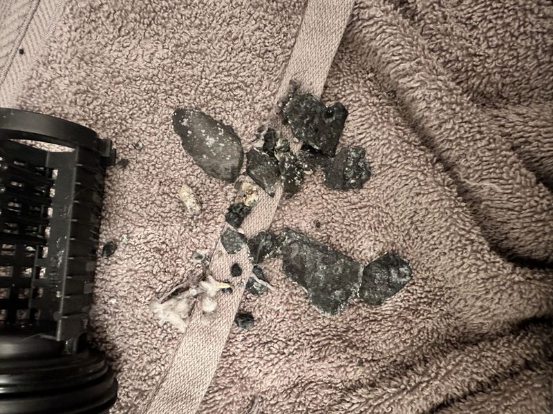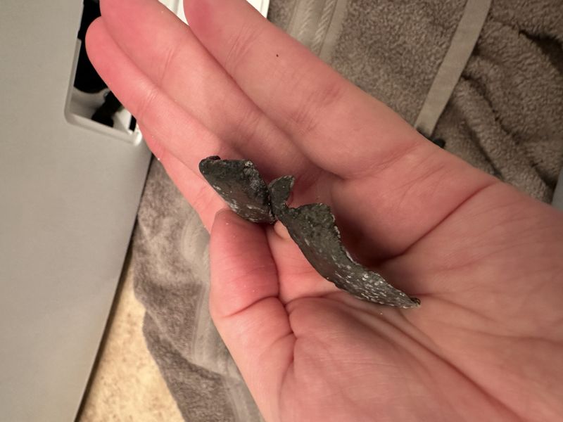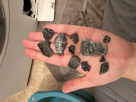 Lorsque j’ai ouvert le bouchon de vidange après avoir vu une flaque d’eau en dessous de la trappe, j’ai trouvé des minéraux d’une certaine taille. Ils sont gris foncés/noirs et ressemblent à des petites plaques pour certains et pur d’autres à des petits cailloux.