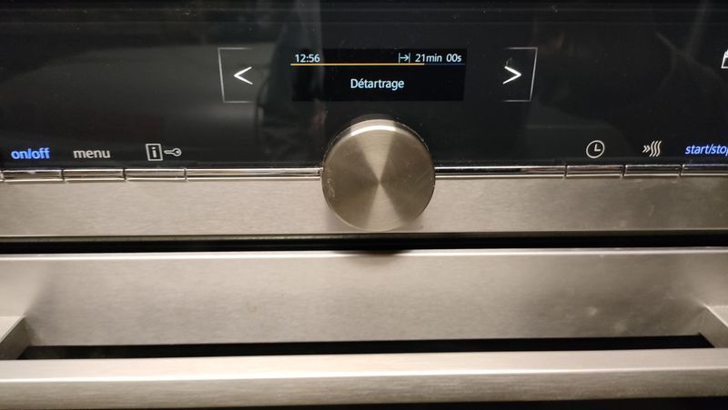 Dès que je met le four sur ON, il demande de rincer le réservoir d'eau et de le remplir, après l'avoir fait, il fait 2 cycles de rinçage, puis un cycle de détartrage. Ensuite il affiche de nouveau le début d'un cycle de détartrage, mais sans pouvoir le lancer, un appui sur la touche Start/Stop n'a aucun effet, il reste bloqué dans cet état. Je ne peux que le mettre sur OFF, toutes les autres touches n'ont pas d'effet. A chaque redémarrage on se retrouve toujours dans le même état. Après une mise hors tension, il redémarre normalement avec mise à l'heure, date, réglage dureté de l'eau, puis demande à nouveau un rinçage puis détartrage comme décrit ci-dessus. J'ai lancé un programme de test, tout à l'air correct (fonctionnement des touches, niveau eau, ).