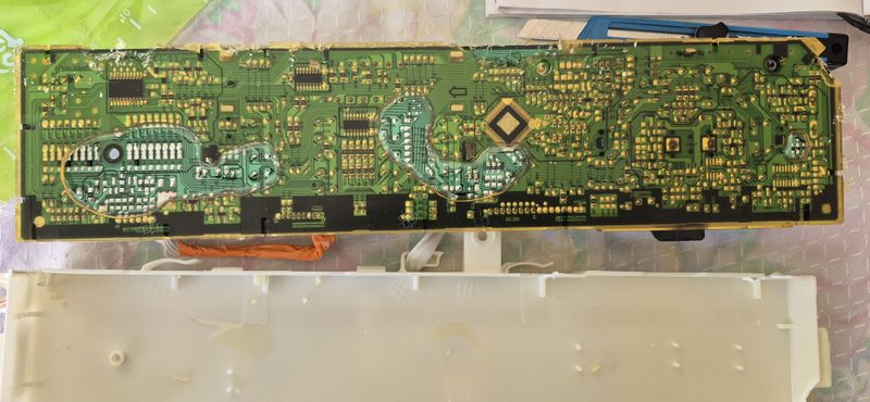 > une fois décollée, puis retournée, on aperçoit les dizaines de points de soudure : soudé par un robot 🤖... et noyés dans cette espèce de vernis mou ...(qui est sensé protéger les composants, mais si les soudures sont trop fragiles..., car mal étudiées ...)