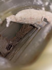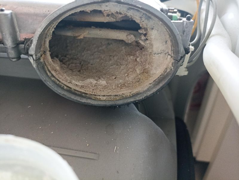 Plus grave, tout le circuit d'air (condenseur, ventilateur, bloc résistance) pour le séchage est complètement encombré de particules sèches blanches, et le condenseur plein de je ne sais qui n'a pas l'air d'être des fibres mais un genre d'amalgame de feuilles de papier humide en partie basse et sec en haut !